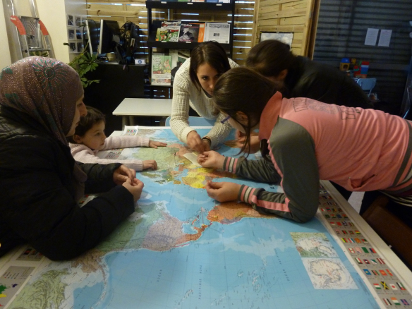 Les enfants quant à eux ont particulièrement apprécié les petits drapeaux qu’il a fallu implanter sur le planisphère installé sur la table pour l’occasion. Cela a été le prétexte à un cours de géographie improvisé. Sur quel continent se trouve la Colombie? Et le Cap-Vert, c’est un pays continental ou des îles? On y parle portugais ? L’Arménie est donc si proche de la Tchétchénie? Pas de problèmes par contre pour placer les drapeaux de la France et de la Tchétchénie.
